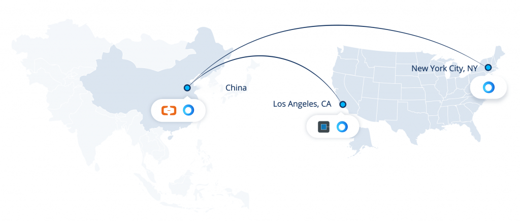 Zenlayer 提供了从中国到洛杉矶和纽约数据中心的连接。每个新的 PoP 部署完成后,仅需几分钟即可将新位置添加到客户的网络和本地阿里云环境中。