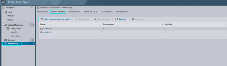 现在,我们导航到左侧面板,选择[Networking](网络)。在右侧,选择[Virtual Switches](虚拟交换机),然后选择[Add Standard Virtual Switch](添加标准虚拟交换机)以打开 vSwitch 配置窗口。
