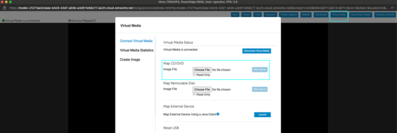 不同制造商之间的步骤可能有所不同。Zenlayer 提供的主机来自Dell、SuperMicro、Inspur 和 HP。在本课程中,我们将遵循 iDRAC 方法。在窗口的右上角,选择[Virtual Media]。将出现另一个窗口,在其中我们将选择[Connect Virtual Disk]。接下来,在 Map CD/DVD 下选择[Choose File]。