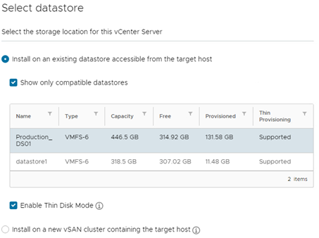 在选择存储vCSA文件的数据存储时,请确保您选择了一个有足够容量的数据存储。在我们的例子中,我们选择了[Production_DS01]。由于可用容量充足,我们将启用精简磁盘模式。如果您正在部署vSAN集群,建议选择[install on a new vSAN cluster containing the target host],因为这将进一步简化后续所需的vSAN部署步骤。请注意,在我们的演示中,我们将不配置vSAN,因此我们将保持此选项未选中。
