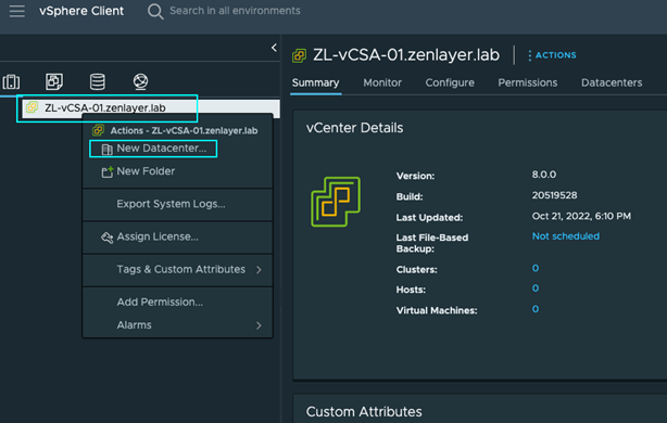 登录后,您将看到vCenter的主机和集群页面。在左侧的面板中展开您的vCenter,然后选择[New Datacenter]。