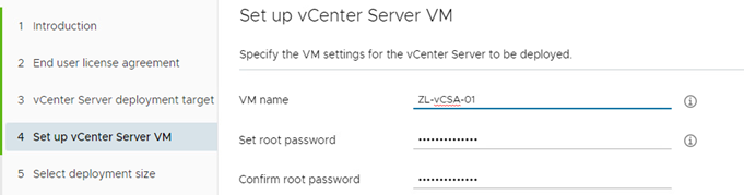 在下一个提示处,在[VM Name]下输入vCSA VM的名称。接下来,提供一个root密码并在下方确认密码。