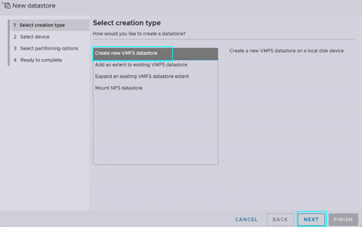 在我们的示例中,我们将创建另一个VMFS数据存储来分隔主机文件和虚拟机文件。在新数据存储窗口中,选择[Create New VMFS Datastore](创建新的VMFS数据存储),然后点击[Next](下一步)。