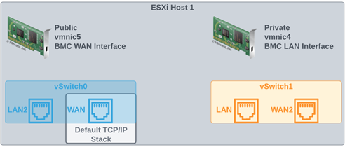默认情况下,部署ESXi时会创建两个端口组,包括虚拟机网络和管理网络。管理网络将由主机用于管理主机网络,使用的是在 vSwitch0 上托管的默认 TCP/IP 堆栈。对管理网络进行更改时应谨慎,因为这可能会影响主机的连接性。如果配置不当,您可以通过 DCUI 恢复网络配置。虚拟机网络用于虚拟机联网。在这两种情况下,它们都通过 vSwitch0 连接到我们的 WAN 接口。我们将通过为单独的虚拟交换机分配专用上行链路来分隔私有网络和生产网络。