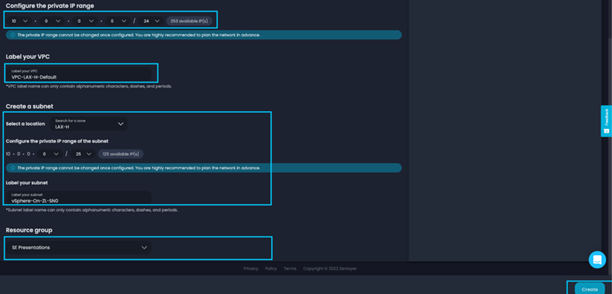接下来,我们将向下滚动以配置 IP 范围。点击下拉菜单,根据可用选项调整[IP范围]。接下来,我们将为这个 VPC 贴上标签。在我们的案例中,我们将它标记为 [vSphere-On-ZL-VPC]。接下来,我们将选择此 VPC 的托管位置,在我们的示例中,该位置将是[LAX-H]。在下面的部分中,配置子网的私有IP范围,我们将使用下拉菜单来调整子网。在本次实验中,我们将通过点击下拉菜单并选择[/25]来演示这一点,并将我们的IP范围进一步细分到/25。最后,为您的子网贴上标签,在本例中我们将其标记为[vSphere-On-ZL-SN0]。如果适用,请选择您的资源组,然后点击[创建]。