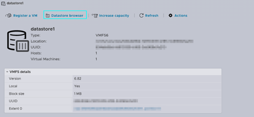 从存储视图中,选择 datastore1(默认数据存储)。之后,在数据存储页面上选择[Datastore Browser](数据存储浏览器)。