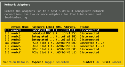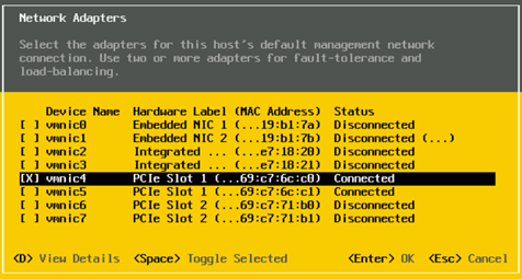 首先,迁移未托管防火墙的ESXi服务器。通过zenConsole使用IPMI导航到DCUI(直接控制台用户界面),更改管理网络使用的vmnic。在我们的案例中,这是[vmnic4]。