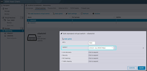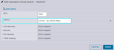 让我们导航到vSwitch1并选择[Edit Settings](编辑设置)。您会看到,因为我们已经将vSwitch0迁移到vmnic4,所以现在vSwitch1没有选择上行链路。使用[Uplink1]下拉菜单并选择[vmnic5]作为您的WAN接口。