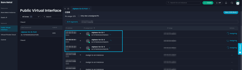 选择您的 PuVI 后,右侧面板上将弹出一个窗口。在这里,您将看到 PuVI 中的每个 IP 地址。选择标有[分配给实例]的下拉菜单,并将 IP 分配给最近配置的主机。选择后,您将在右侧看到一个旋转的轮子,显示正在分配。在退出此窗口之前,请点击[概述]并查看此选项卡的内容,记下您的网络和 VLAN ID。