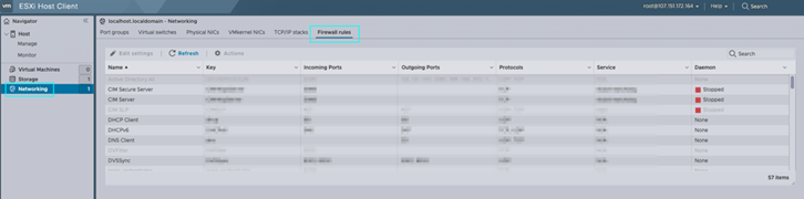 现在,让我们通过限制外部访问来增强这个主机的安全性。登录后,在左侧面板中选择[Networking](网络),导航到网络设置。然后,在右侧面板中选择[Firewall rules](防火墙规则)。您将看到此ESXi的本地防火墙规则。滚动到已启用的服务部分,并根据需要应用您的白名单。在我们配置防火墙之前,我们将临时这样做。