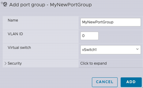 在选择[Add Port Group](添加端口组)后,将弹出一个端口组配置窗口。在这里,为您的端口组指定一个名称,我们在本例中将其称为LAN。选择0表示不分配VLAN——这是由于我们在后端进行的网络分配,对于BMC来说是必需的。对于MHS,您可以进一步指定VLAN标签。接下来,选择在前一节中创建的[vSwitch1]。完成这些步骤后,点击[ADD](添加)以应用您的配置。