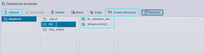 在您的数据存储浏览器中,选择[Create Directory](创建目录)。创建一个标签为 [ISOs] 的目录。接下来,我们要在这个数据存储上本地上传 ISO 文件。选择 [Upload](上传),并使用您的本地资源管理器将 ISO 文件传输到数据存储中。在我们的示例中,您可以看到我们标签为 [ISO] 的目录以及上传到这个目录中的 ISO 文件。