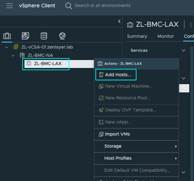 现在我们已经配置了集群,接下来将主机添加到这个vCenter中。导航到您的集群,右键单击并选择[添加主机]。