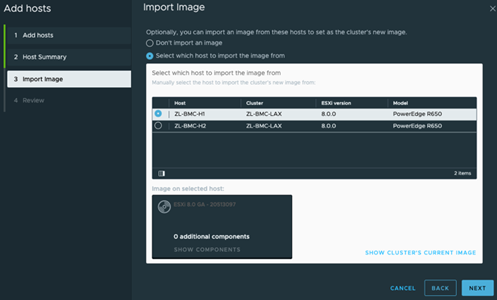 接下来,您将被提示选择一个主机以从中复制集群映像,或者完全不进行选择。在这里,如果您还没有一个集群映像,并且您的ESXi映像配置符合您组织的要求,您可以选择复制此主机的映像并保留在集群中。