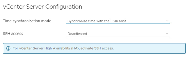在下一个提示中,选择[Time Synchronization]并输入您的NTP地址,或者与您的ESXi主机同步时间。如果要配置vCenter Server高可用性,请选择[SSH Access]以启用SSH。在我们的示例中,我们将保持此功能未激活,因为我们的ESXi没有连接到共享存储。