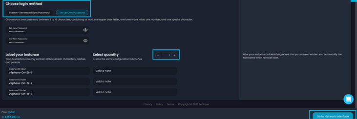 完成分区配置后,您可以进入“登录方式”部分。如果您选择“系统生成根密码”,密码将发送到注册账户的电子邮箱。如果您选择“设置自己的密码”,则需要在下面的字段中指定密码。接下来,我们将数量调整为(3),并展开“标记您的实例”部分,以包括(3)行规格。在为您的机器标记后,请点击“转到网络接口”以进行下一步。