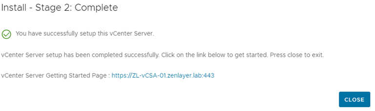 安装成功后,您将收到vCSA的凭据提示。在验证信息后,选择[CLOSE]以完成安装。之后,您可以通过网页浏览器访问您的vCenter以进行验证。