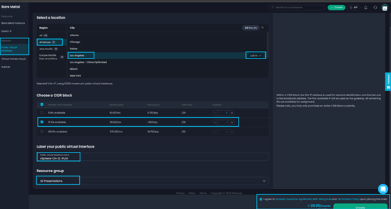 让我们从左侧面板开始,选择[公共虚拟接口]。然后,选择您已配置 BMC 的同一城市和区域。在我们的案例中,我们将选择[洛杉矶]和 [LAX-H] 区域。接下来,我们将选择首选的 CIDR 块。在本次实验中,我们将选择[13个IP或/28]。在以下对话框中为您的 PuVI 贴上标签。在我们的示例中,我们将此 PuVI 标记为 vSphere-On-ZL-PuVI。最后,如果适用,请选择您的资源组,然后点击[Zenlayer 协议]并通过点击[创建]来完成订单。