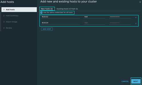 在[新建主机]标签页的提示下,将您想要添加到这个vCenter的每个主机添加进来。您还可以点击[对所有主机使用相同的凭据]旁边的单选按钮以进一步简化流程,然后点击[下一步]继续。现在,您可能会被提示验证并接受您的ESXi主机的证书。选中每个主机旁边的单选按钮,并点击[确定]继续。