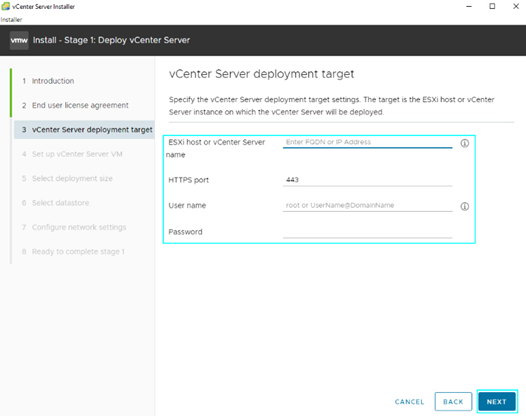 在下一个提示处,指定托管vCenter的ESXi的[IP]。如果HTTPs端口号与默认值不同,请输入它。最后,输入您的ESXi主机的凭据。请确保您的主机可以从您部署vCenter的设备上访问网络。点击[NEXT]。