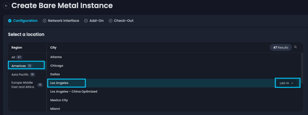 点击之后,您将被带到“创建裸机实例”页面。在这里,您需要选择部署 BMC 的位置。在我们的案例中,我们将选择【美洲】,然后在右侧面板中进一步指定【洛杉矶】。如果您所选的设备配置不可用,可以选择其他区域以查看其可用性。在这里,我们已经选择了【LAX-H】。