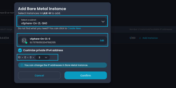 点击[+添加实例]后,将弹出一个新窗口。在这里,选择您最近创建的子网[vSphere-On-ZL-SN0]。接下来,使用下拉菜单选择您的 BMC,并勾选[自定义私有IPv4地址]旁边的复选框。最后,按顺序指定分配给此主机的私有 IP。点击[创建],然后重复剩余主机的步骤