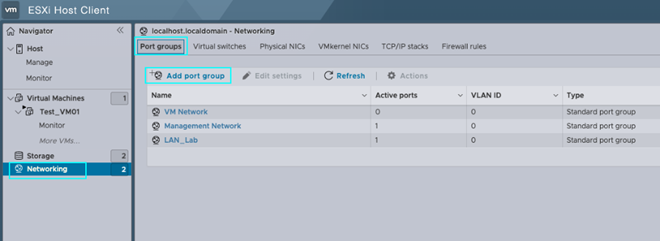 现在,我们来配置端口组。在相同的左侧面板“Networking”(网络)选项卡下,选择[Port Groups](端口组),然后选择[Add Port Group](添加端口组)。