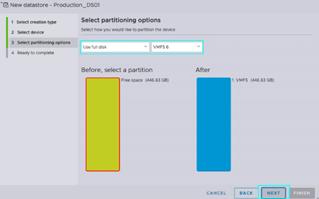 现在到了选择分区选项的时候了。对于这个示例,我们将使用整个磁盘容量并保持默认设置。按[Next]继续。在检查您的配置后,在下一个提示中选择[Finish](完成)以配置您的数据存储。