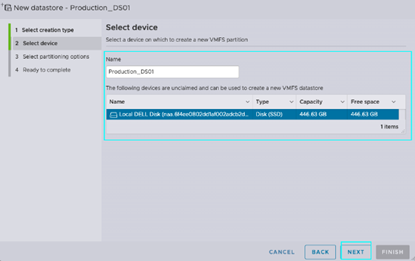 在下一个提示中,您将被要求选择磁盘并为这个VMFS数据存储提供标签。在这里,我们将其标签设置为[Production_DS01],并选择之前在iDRAC中预配置的虚拟磁盘。按[Next]继续到下一步。