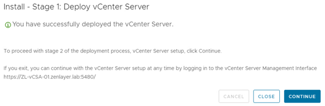 安装完成后,您将被提示通过点击[Continue]继续下一步。或者,您可以通过访问带有端口5480的vCSA地址(例如:https://10.0.0.15:5480)返回到此步骤。