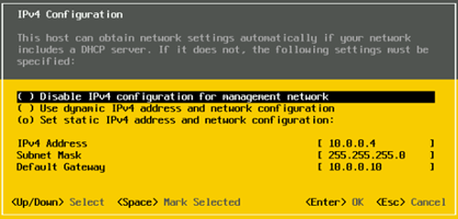 将IPv4配置更改为在PrVI配置期间之前分配的LAN IP地址,在我们的案例中这是[10.0.0.4/24]。我们已将LAN网关[10.0.0.10]分配给我们的主机。选择[Enter]以确认更改。